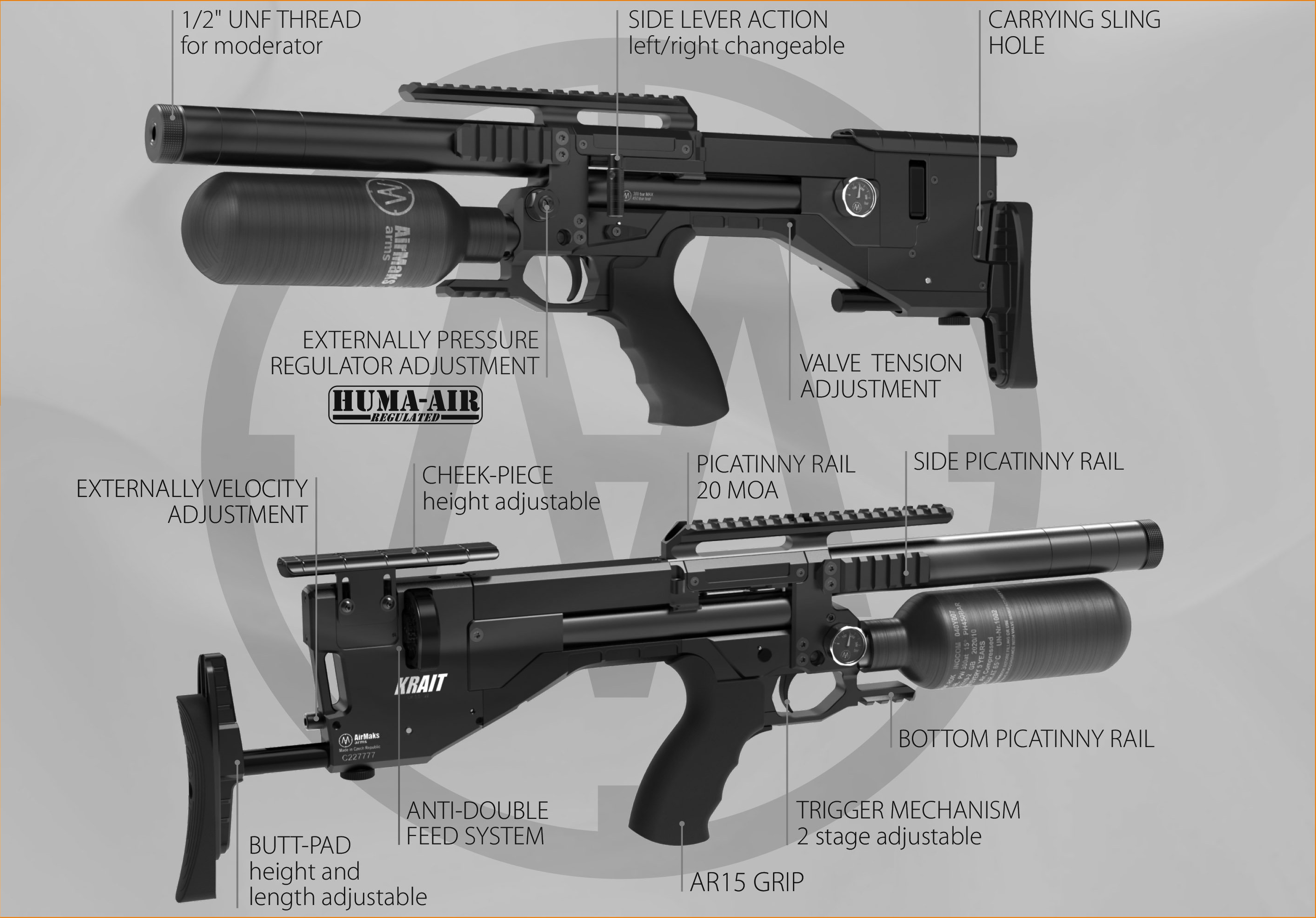O Airmaks Krait WL é um rifle bullpup PCP leve e de alto desempenho, perfeito para tiro com projéteis. Ele possui um inovador sistema anti-alimentação dupla e uma alavanca lateral reversível. A empunhadura ergonômica AR15 e a coronha ajustável garantem um ajuste confortável para atiradores destros e canhotos. Com cano revestido, módulos removíveis e múltiplos trilhos Weaver/Picatinny para acessórios táticos, o Krait WL é versátil e potente, com regulador ajustável externamente, cilindro de ar de fibra de carbono de 480 cc e plenum de potência de 60 cc.