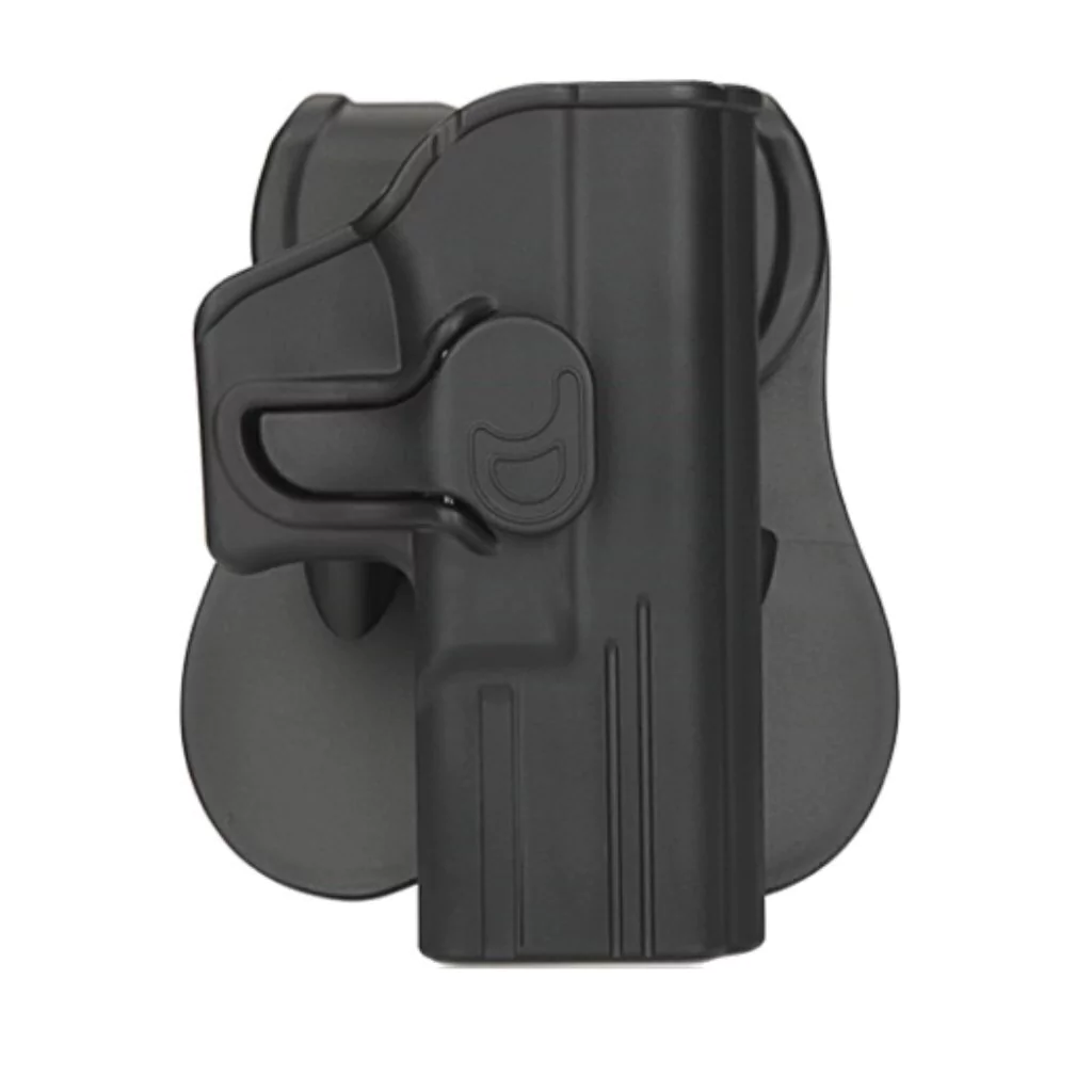 Múltiplas formas de transporte O coldre Amomax é compatível com 4 plataformas de transporte diferentes - pá (padrão), clipe para cinto, MOLLE e plataforma para perna rebatida. Todas as plataformas de transporte podem ser substituídas por apenas um bolt. O usuário pode carregá-los no uso diário, esportes ao ar livre, treinamento de tiro normal e competição. O coldre ficará firme no cinto, na perna e no sistema MOLLE, mesmo em movimentos rápidos. Rotação de 360 graus O corpo do coldre e a plataforma de transporte são conectados a uma engrenagem dentada. O corpo do coldre tem uma rotação de 360 graus. O usuário pode ajustar facilmente a posição de transporte. Passos para ajustar a posição de transporte: Afrouxe o único bolt na parte traseira Gire o corpo do coldre para ajustar a posição de transporte Aperte o bolt e conclua o ajuste Compatibilidade: STI Hi-Capa 2011 Series Pistols/ TOKYO MARUI / WE / KWA / KJW / NOVRITSCH *IMAGENS MERAMENTE ILUSTRATIVAS