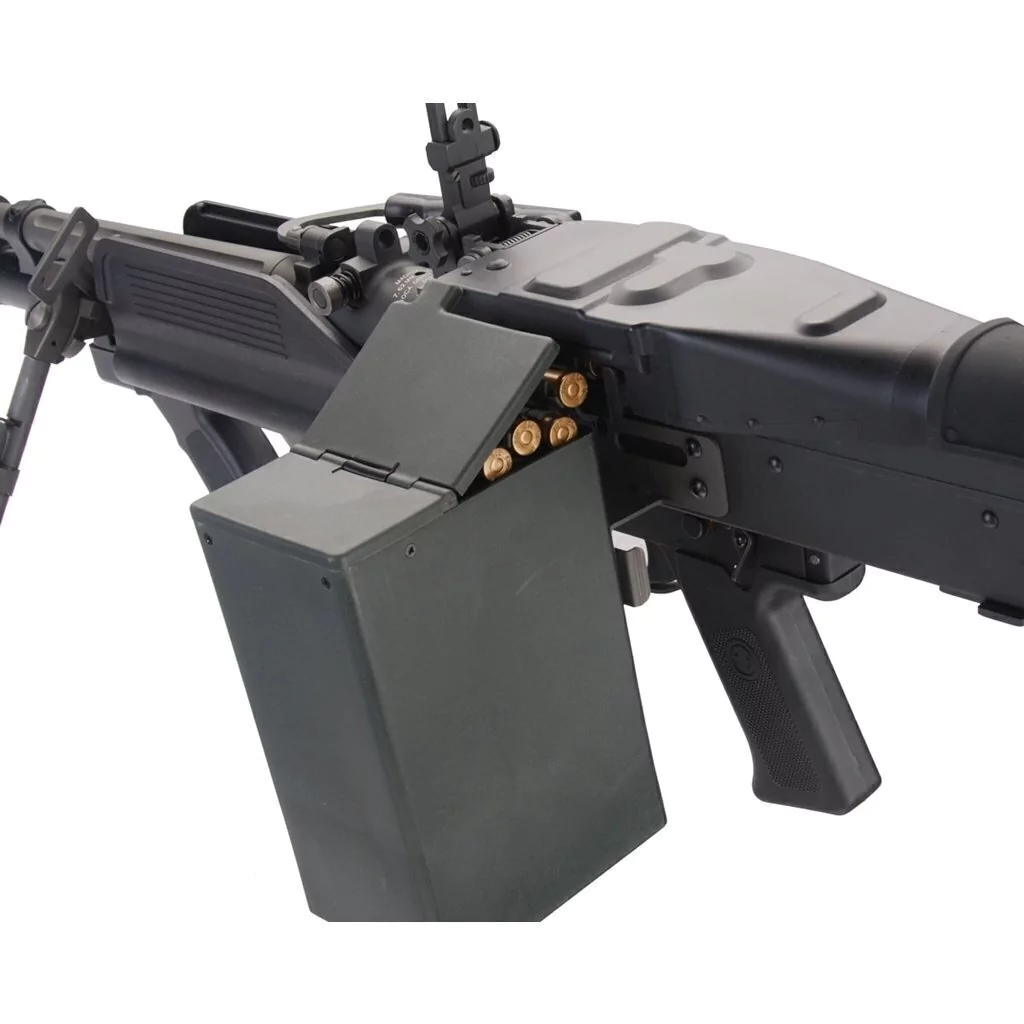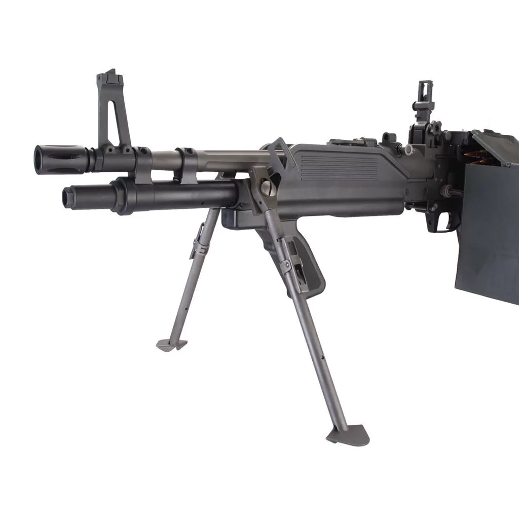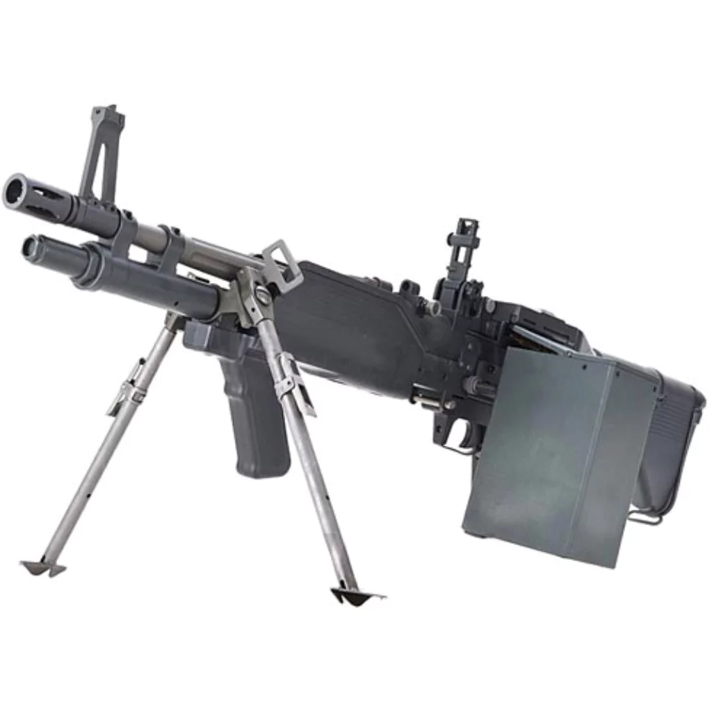 A Arsoft MK-43 M60 Airsoft Gun é um novo tipo de SAW para o artilheiro prático do time de arsoft. Esta arma é extremamente leve devido à construção plástica do corpo, mas não cometa o erro de pensar que, por ser plástico, é um AEG de baixa qualidade. Ares trabalha no negócio do airsoft há anos e são uma das melhores atenções às empresas orientadas para o detalhe no mercado. A construção de polímero dá ao MK43 uma qualidade de construção robusta que rivaliza com armas de metal mais cheias porque o polímero flexiona em vez de fraturas sob impacto. Algumas partes do exterior são feitas de metal, como o bipé e o trilho inferior. Uma vez que o peso total desta arma é gerenciável pela maioria dos jogadores, a Ares incluiu um aperto vertical que você pode prender ao trilho para apontar com precisão e aumentar a mobilidade. Internamente, o MK43 possui uma GearBox completa com o famoso sistema de mola de mudança rápida de Ares. O procedimento para mudar a mola nesta arma literalmente leva 5 segundos; primeiro abra a tampa do receptor, em seguida, empurre a guia da mola na caixa de velocidades um pouco, vida a alavanca na parte superior da caixa de velocidades para libertar o guia da mola, e voila, a mola é gratuita! Não são necessárias ferramentas ou treinamento especial de aeromoça. Outra característica excelente sobre esta arma é a magazine de enrolamento automático. O motor para enrolar a magazine é conectado ao interruptor de gatilho na pistola, de modo que a mag só serpenteia quando o gatilho é puxado. Ares tem sido, e continua sendo, líder da inovação em Airsoft, e este novo MK43 é um excelente exemplo dessa inovação.