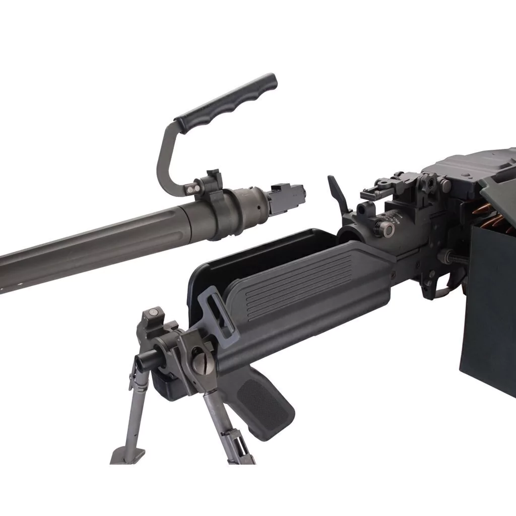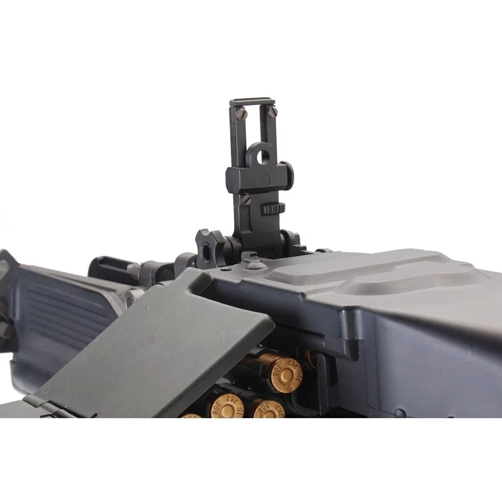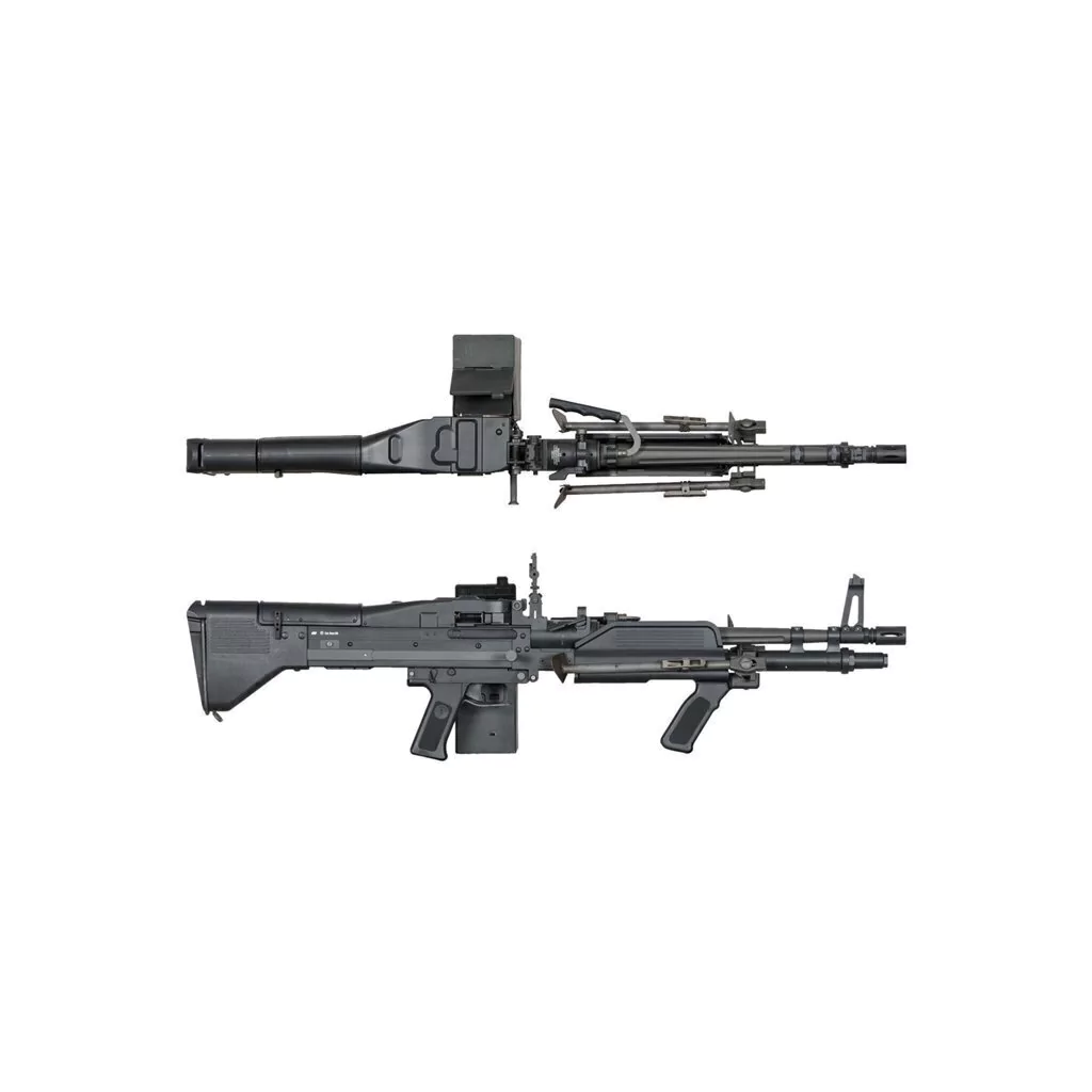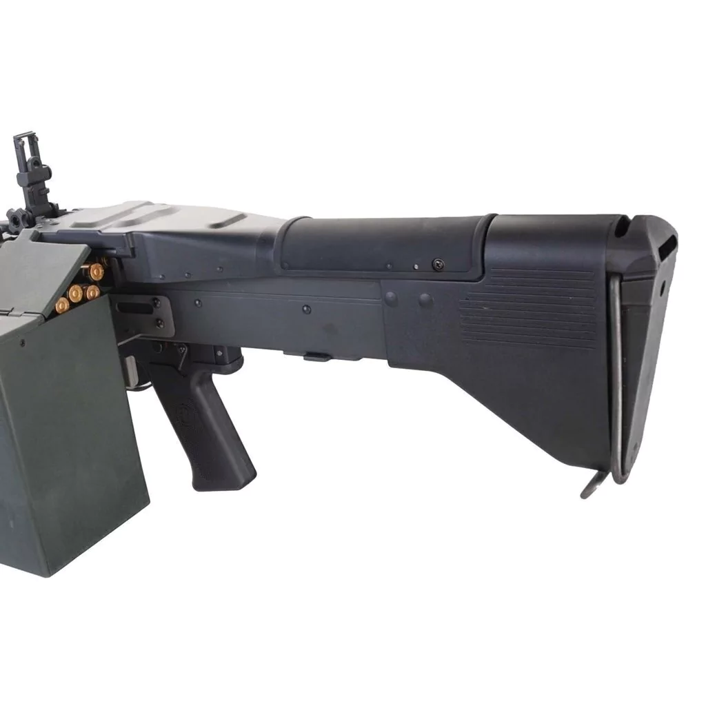 A Arsoft MK-43 M60 Airsoft Gun é um novo tipo de SAW para o artilheiro prático do time de arsoft. Esta arma é extremamente leve devido à construção plástica do corpo, mas não cometa o erro de pensar que, por ser plástico, é um AEG de baixa qualidade. Ares trabalha no negócio do airsoft há anos e são uma das melhores atenções às empresas orientadas para o detalhe no mercado. A construção de polímero dá ao MK43 uma qualidade de construção robusta que rivaliza com armas de metal mais cheias porque o polímero flexiona em vez de fraturas sob impacto. Algumas partes do exterior são feitas de metal, como o bipé e o trilho inferior. Uma vez que o peso total desta arma é gerenciável pela maioria dos jogadores, a Ares incluiu um aperto vertical que você pode prender ao trilho para apontar com precisão e aumentar a mobilidade. Internamente, o MK43 possui uma GearBox completa com o famoso sistema de mola de mudança rápida de Ares. O procedimento para mudar a mola nesta arma literalmente leva 5 segundos; primeiro abra a tampa do receptor, em seguida, empurre a guia da mola na caixa de velocidades um pouco, vida a alavanca na parte superior da caixa de velocidades para libertar o guia da mola, e voila, a mola é gratuita! Não são necessárias ferramentas ou treinamento especial de aeromoça. Outra característica excelente sobre esta arma é a magazine de enrolamento automático. O motor para enrolar a magazine é conectado ao interruptor de gatilho na pistola, de modo que a mag só serpenteia quando o gatilho é puxado. Ares tem sido, e continua sendo, líder da inovação em Airsoft, e este novo MK43 é um excelente exemplo dessa inovação.