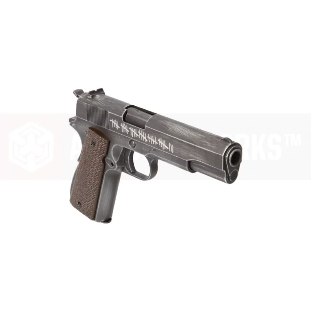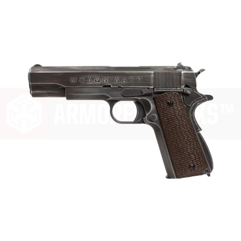 The Armorer Works "MOLON LABE" 1911A1 presta homenagem ao clássico USGI sidearm. A réplica de pistola apresenta um lindo acabamento de pátina de imitação e intemperismo para se assemelhar à aparência endurecida da batalha de uma arma de serviço que passou por muitas batalhas. A expressão clássica do desafio ΜΟΛΩΝ ΛΑΒΕ (mol?n lab) e matar as contas são corajosamente esculpidas no slide para mostrar a rendição não é uma opção e tomar essa arma virá a um custo excelente.