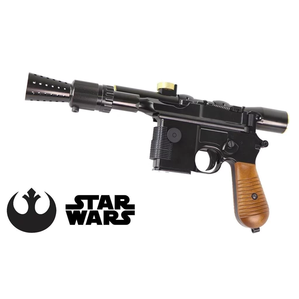 A pesada pistola blaster de Han Solo era uma versão modificada do modelo padrão DL-44 da BlasTech Industries. Como todos os DL-44s, o blaster de Solo ofereceu um poder de fogo acima da média sem comprometer a precisão e foi uma das razões pelas quais a arma era tão ideal para o contrabandista. Também era facilmente modificável, o que permitiu a Solo fazer uma série de modificações, incluindo, em um ponto, a remoção da mira telescópica sensível ao movimento do blaster. Solo fez isso para que a pistola blaster pudesse ser sacada mais rapidamente do coldre e melhorar seu tempo de reação, mas também porque ele estava confiante em sua própria mira. Mesmo em sua vida posterior, à medida que envelhecia, Solo permaneceu um empate rápido.