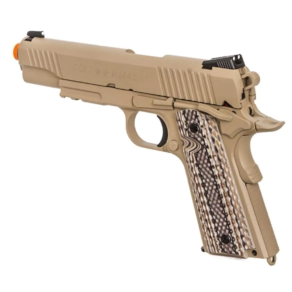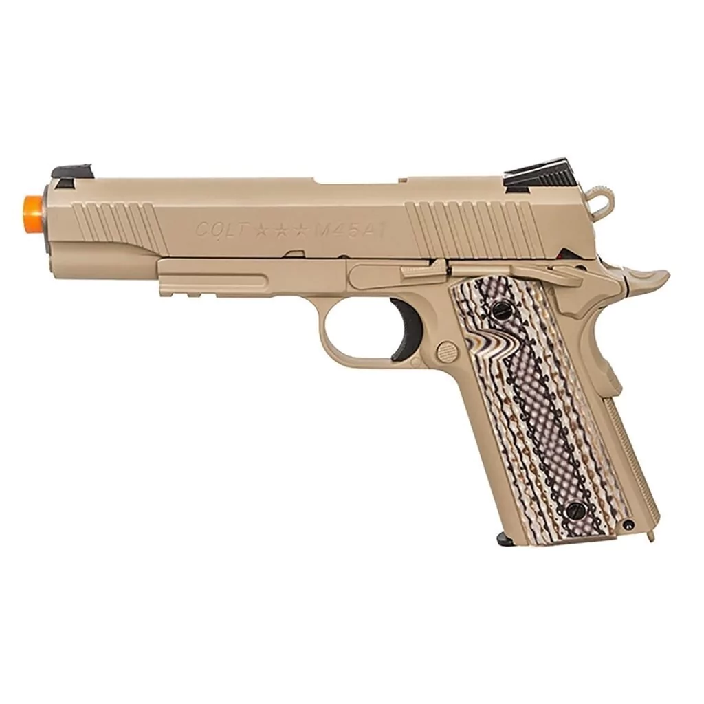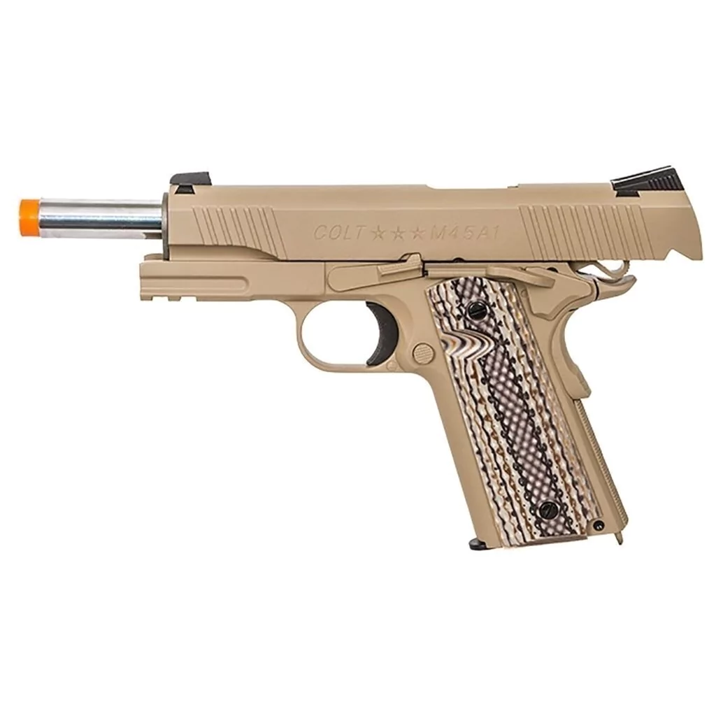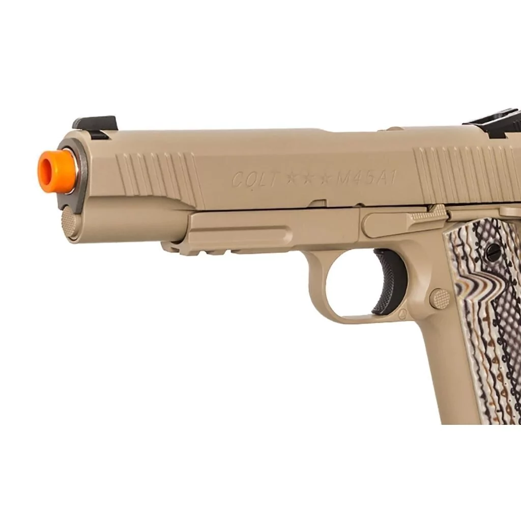 O M45A1, semelhante à plataforma M1911, é popular e comum que seu uso é bem conhecido e praticado por muitos jogadores e fácil de encontrar coldres para e a pistola é toda em metal para grande peso e sensação. Esta réplica é bem colocada e pode competir com um monte de pistolas GBB no mercado até à data, e todas as travas de controle e tal são nítidas e seguras.