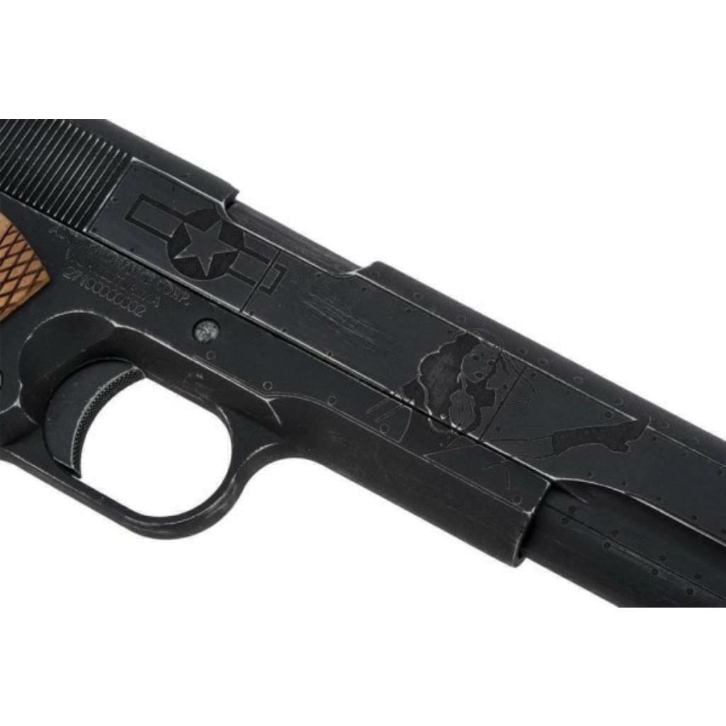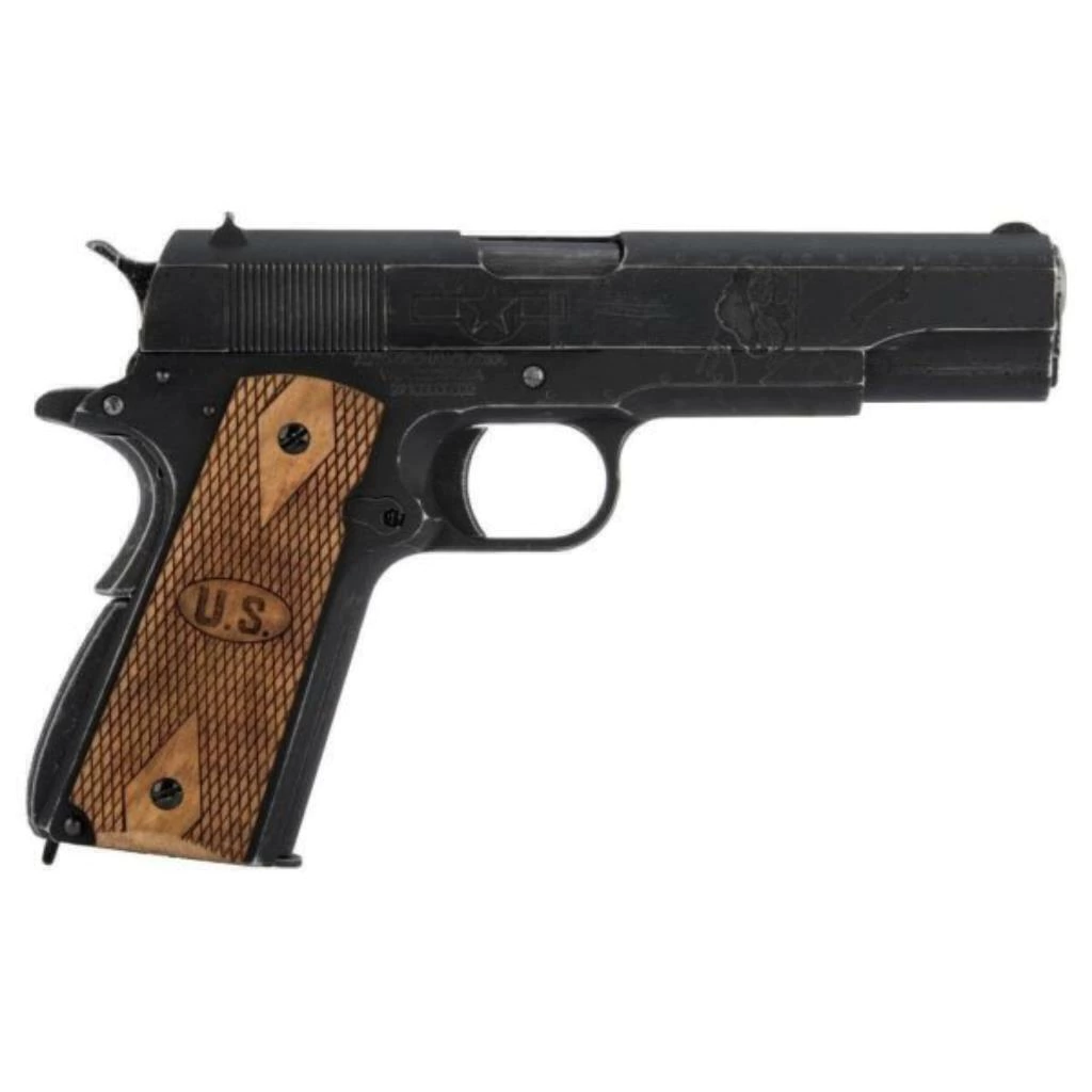 Em colaboração com a Auto-Ordnance, a Cybergun recria com precisão esta obra-prima de uma arma de fogo na forma de Airsoft. Os detalhes de caça são cortados a laser profundamente no slide e na própria moldura para destacá-los sobre a gravação de superfície padrão. Cada pistola é envelhecida para dar à arma uma boa aparência de combate endurecida e desgastada que realmente dá à arma o caráter. Finalizando o nível de detalhes finos estão os belos punhos de madeira real que são cortados a laser com precisão com textura de diamante e insígnias dos EUA.