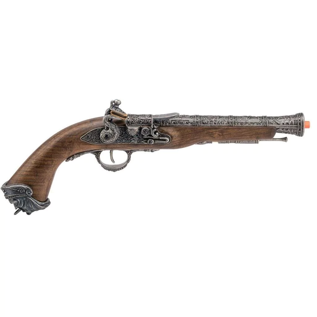 Uma base de madeira falsa e imitação de metais banhados a latão conferem a esta peça de réplica do período uma sensação robusta e um nível de autenticidade que tornam esta arma verdadeiramente única. A bela filigrana ornamentada realmente vira a cabeça quando você usa sua pistola de pederneira para acabar com a briga entre você e os malvados que ousam insultar sua boa natureza. Equipado com características realistas semelhantes a uma pistola de pederneira real, você passa pelas etapas de armar o hammer e travar a bandeja de flash antes de disparar a arma. Essa abordagem de pederneira e aço para engatilhar e disparar cada tiro realmente diferencia essa réplica com um pouco mais de autenticidade. Incluído com a pistola, está um frasco de pó de couro falso para segurar e carregar o BB, bem como um pergaminho em estilo pergaminho enrolado para o manual de instruções.