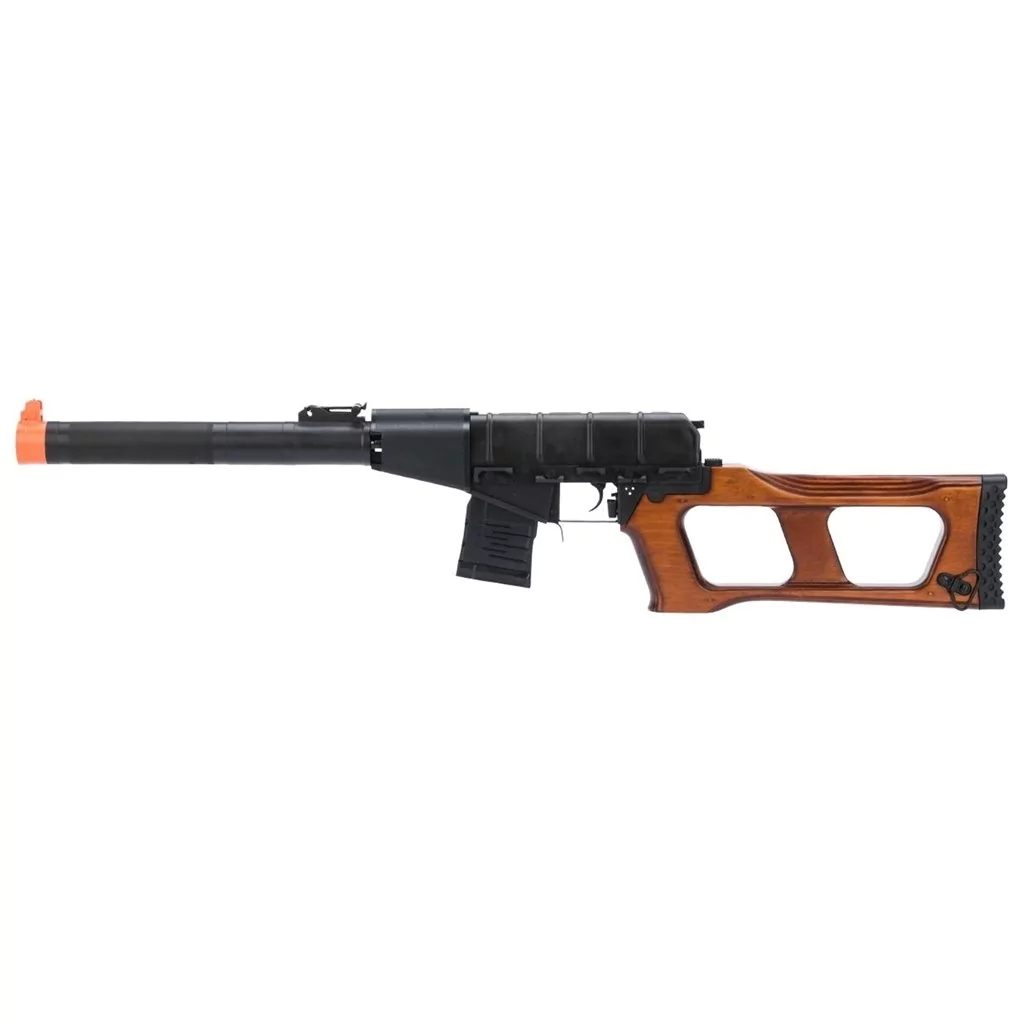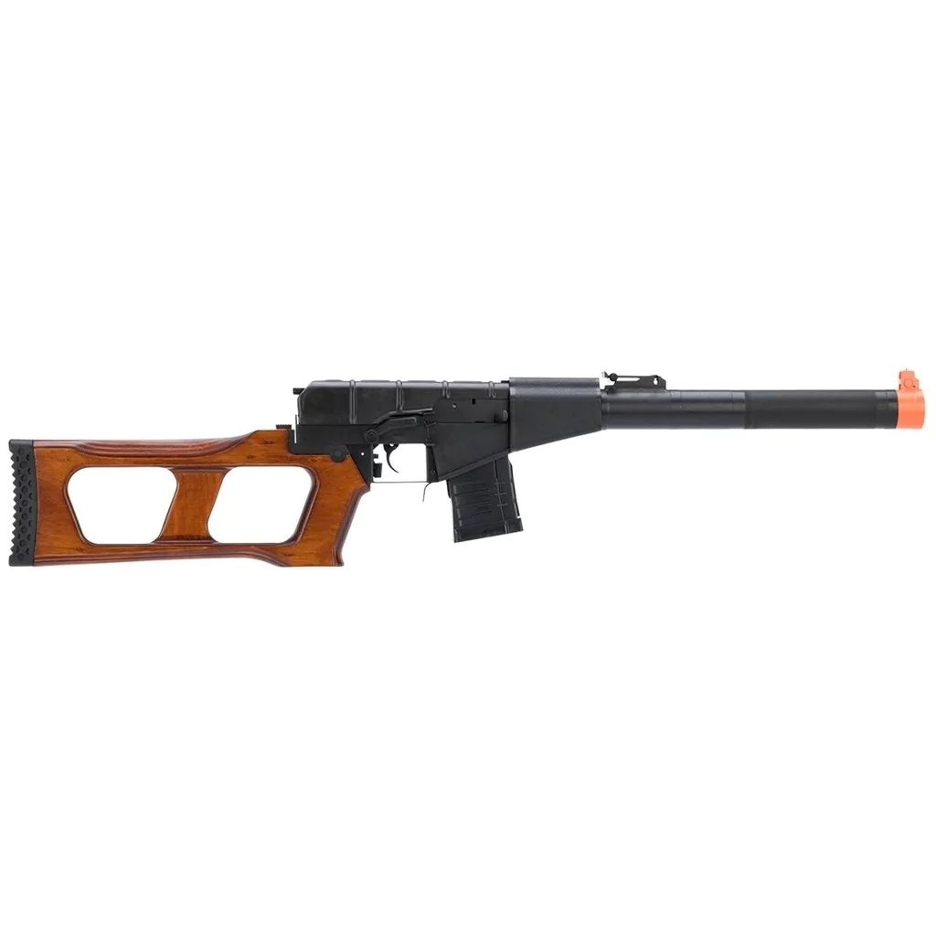 O VSS Vintorez é um rifle sniper russo suprimido, desenvolvido no final dos anos 80 para operações secretas ou clandestinas; um papel evidenciado por sua capacidade de ser retirado para transporte em uma maleta especialmente montada. O Rifle Sniper AEG VSS Vintorez Airsoft da King Arms é totalmente em metal com móveis de madeira reais, com um seletor de modo de disparo realista e funcional, alavanca de segurança em aço e botões funcionais de desmontagem frontal e traseira.
