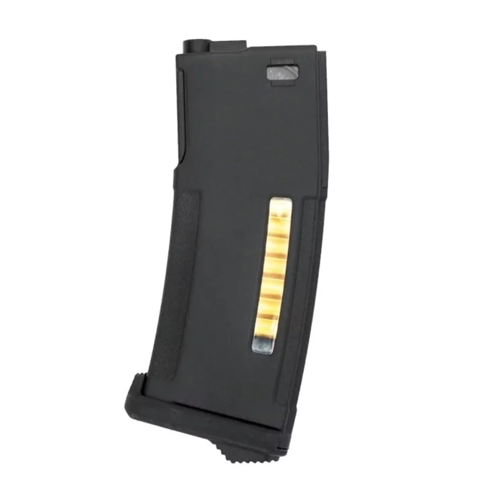 O PTS® Enhanced Polymer Magazine, ou EPM para abreviar, é um novo tipo de magazine de polímero de capacidade média para AEGs. O EPM é uma Magazine AEG verdadeiramente única, por dentro e por fora. Externamente, ele apresenta uma concha de polímero Dupont Zytel, com painéis rebaixados para melhor aderência e guias de compartimento de Magazine exclusivos que reduzem o empecilho quando o compartimento é retirado e reinserido em bolsas. A janela de bala com os cartuchos 556 falsos não é apenas para exibição. Quando o magazine está totalmente carregado, na base da janela com marcadores transparente, um seguidor laranja aparece. Este é um notável recurso de design exclusivo do EPM, pois permite que o usuário final pegue qualquer carregador EPM e saiba imediatamente se o carregador está cheio e pronto para usar. Ele também atua como um indicador visual para o usuário saber quando parar de carregar a Magazine. Outra característica notável da Magazine é a placa de base. A parte inferior da placa de base foi projetada com uma superfície angular e um molde de borracha na face inferior. Essa combinação de recursos permite que o usuário final descanse a arma em qualquer plataforma de tiro plana e tenha mais contato com a superfície com melhor tração e, portanto, maior estabilidade. A superfície inclinada é minimizada a ponto de ser funcional, mas ainda confortável na mão quando retirada de bolsas e também não inibe o fechamento de abas em bolsas de Magazines de topo fechadas. A placa de base também foi projetada com uma saliência nervurada que facilita a extração do magazine de bolsas profundas e pode ajudar o usuário final a indexar corretamente o magazine. Este magazine AEG de capacidade média detém 150 cartuchos com a mesma confiabilidade pela qual todos os magazine PTS são famosos. É compatível com a versão 2 de AEGs M4 da TM, KWA, PTS PDR-C, série PTS ERG, PTS Masada, G&P, VFC 416, CA 416 e as variantes AMOEBA AM.