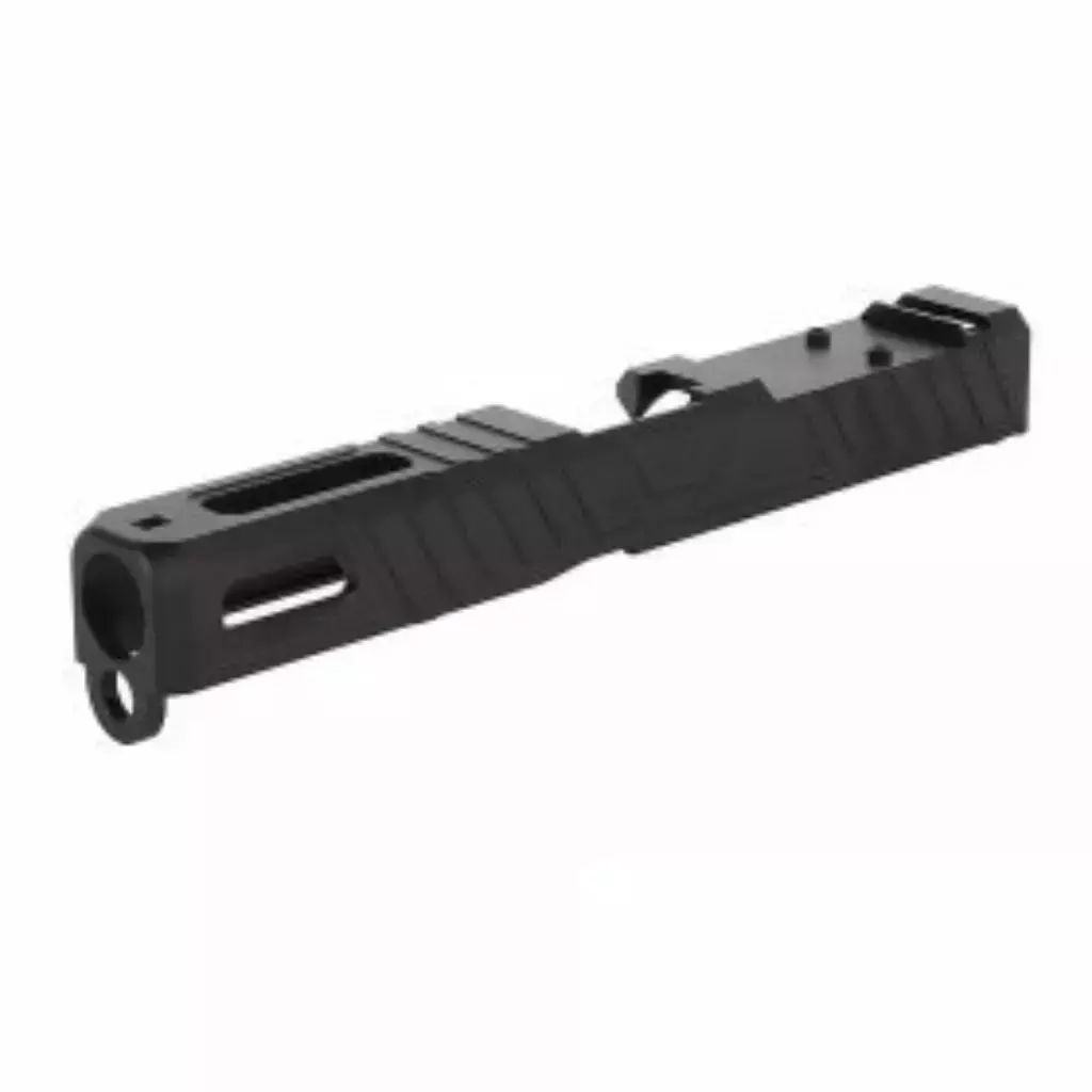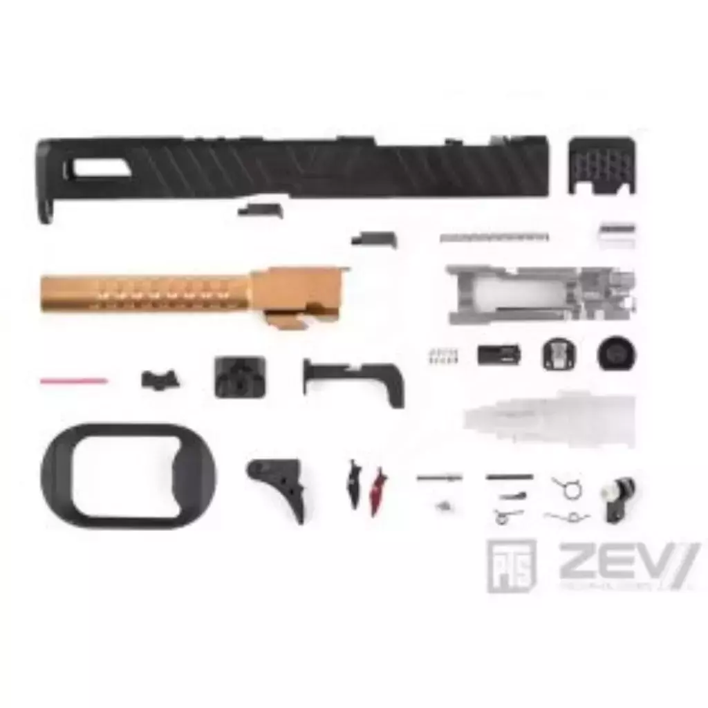 As linhas no slide ZEV Omen criam uma elegância agressiva que é simples, mas eficaz. Os serrilhados são necessários ao longo da lateral e superior nos pontos certos para fornecer uma pegada sólida ao manipular o slide. As janelas dianteiras introduzidas o peso alternativo, ou que, por sua vez, reduz a fadiga e permite uma colocação de acompanhamento mais rápido. As lâminas PTS Zev são usinadas com precisão em alumínio da série 6000 e projetadas para uma plataforma TOKYO MARUI G17. Ele também pode servir WE e KJ G17s com algumas pequenas modificações (consultado um técnico profissional de airsoft para instalação). Pode-se escolher entre 2 configurações de visores red dot diferentes - uma para o Trijicon RMR e outra para o Leupold DP-PRO).