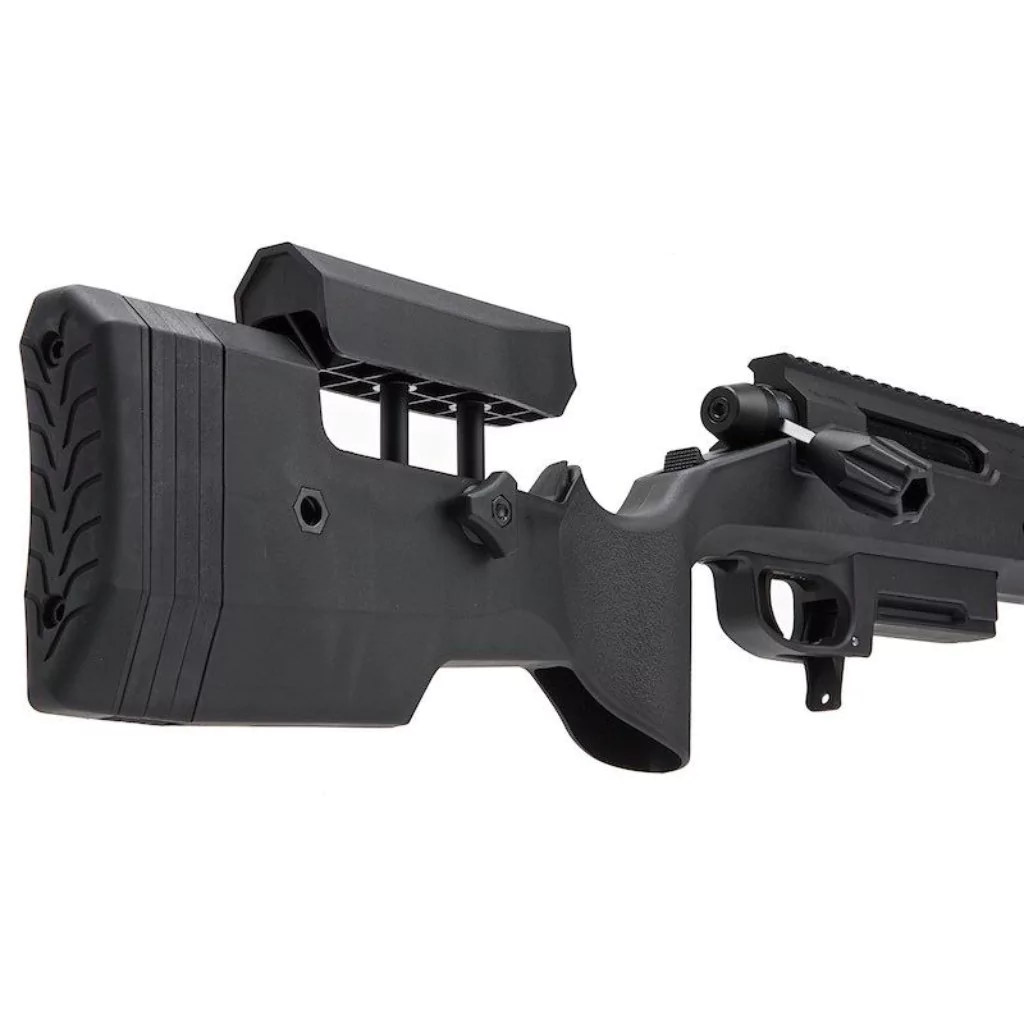 Livre das restrições de uma forma definida, Silverback construiu o TAC41P de forma que eles percebessem o melhor rifle de atirador que poderia ser. Começando com um chassi projetado originalmente. O chassi é um material de polímero leve, mas altamente robusto, que ergonomicamente parece muito natural na mão. A superfície de aperto é considerada relativamente reta em comparação com outros estilos, muito parecido com o visto em rifles de precisão estilo M40. O descanso curvo onde seu polegar vai é moldado de uma maneira que tira grande parte do esforço de sua posição de agarrar, tornando mais fácil atirar e ficar focado por longos períodos de tempo. Em direção à posição dianteira do chassi, você encontra slots M-LOK nas posições de três, seis e nove horas e apresenta um bolt capturado para a montagem de tripés de câmera, monopods e outros suportes montáveis por bolt. A parte traseira do rifle apresenta um riser de bochecha ajustável que é altamente personalizável e fácil de implantar. Você também pode ajustar o comprimento da tração com espaçadores incluídos para uma experiência de ombro personalizada.