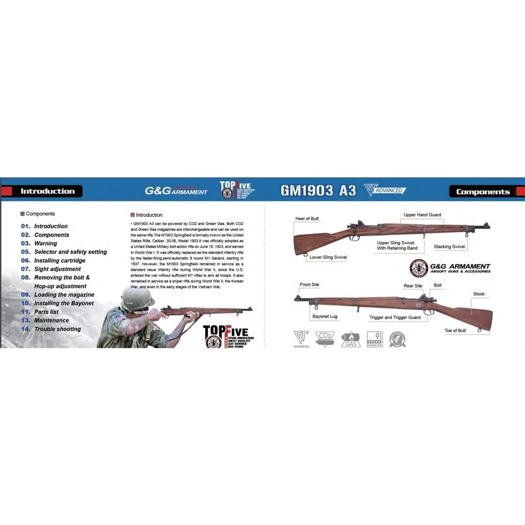O M1903 Springfield, formalmente o Rifle dos Estados Unidos, Calibre .30-06, Modelo 1903, é um rifle de serviço de bolt-action americano, alimentado por uma magazine de 5 voltas, usado principalmente durante a primeira metade do século XX. Foi oficialmente adotado como um rifle de ação militar dos Estados Unidos em 19 de junho de 1903, e serviu na Primeira Guerra Mundial. No entanto, o M1903 Springfield permaneceu em serviço como um rifle de infantaria padrão durante a Segunda Guerra Mundial, a Guerra da Coréia, e até mesmo nos estágios iniciais da Guerra do Vietnã. O GM1903 se parece muito com o Kar98k, já que o sistema de ação do bolt é muito similar. Embora possa não ser tão complexo quanto o Tanaka Kar98k, a ação suave do bolt é satisfatória para ver e ouvir. Desde que esta é uma réplica de airsoft, você não precisa puxar o bolt todo o caminho de volta para a câmara do próximo BB como até mesmo uma polegada de volta é suficiente. É feito de madeira real com uma combinação de peças metálicas de aço e zinco. Parece fantástico, embora não seja o rifle sniper mais skirmishable, mas você não vai conseguir que ele escarreça com muito. O GM1903 pertence a uma parede. Se você fosse retirá-lo, os 440 fps que ele dá são suficientes para levar nossos alvos de longe sem nenhum problema. Você definitivamente precisará carregar mais magazines, pois as 9 rounds podem ser mais rápidas do que você imagina.