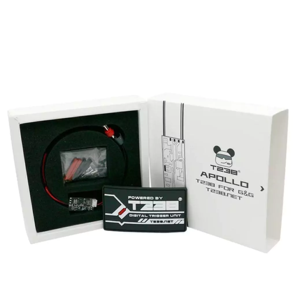 Apollo é um MOSFET programável especialmente projetado para a réplica G&G AIRSOFT. Com processador de alta velocidade e 2 chips MOSFET de alta potência, este sistema possui muitas funções programáveis individualizadas, como posicionamento de pistão, gatilho binário, tiro múltiplo e assim por diante. Além disso, também tem as funções de proteção de baixa tensão da bateria e proteção contra bloqueio da GearBox. Ele pode efetivamente melhorar a estabilidade, a velocidade de disparo e a velocidade de resposta da GearBox, ao mesmo tempo, pode eliminar completamente o problema de disparo único da GearBox se tornar múltiplo. O módulo usa no máximo 4S baterias.