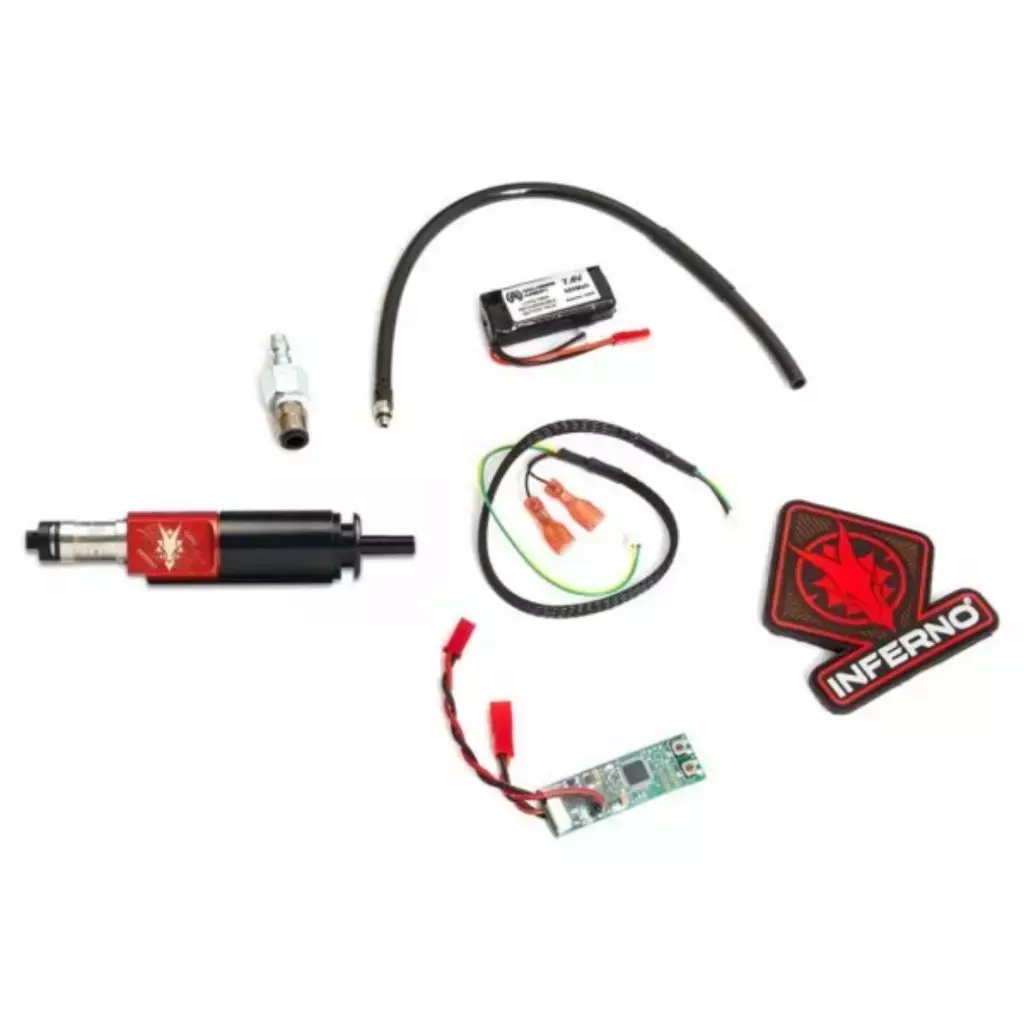 O GEN 2 INFERNO apresenta um solenóide único revolucionário, um cone independente e um design de bocal que estabeleceu um novo padrão para o design do kit de queda. Particularmente, ele é projetado para resolver o "problema do bolt aberto". É um projeto híbrido que mantém as vantagens de um sistema de bolt aberto: ajuste fácil, sem tiro seco na primeira rodada, eficiência, etc. Ao mesmo tempo em que adiciona a simplicidade de ajuste de salto mais fácil que os sistemas de parafuso fechado tradicionalmente oferecem. Além disso, melhora ainda mais a eficiência em relação a outros sistemas Wolverine em cerca de 10 a 15%.